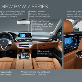 En cuanto al interior dentro de las características más destacadas se aprecia el cambio en el volante el cual se describe con distintos tipos de piel que brindan demasiada comodidad así como la bandeja de carga inalámbrica para teléfonos móviles compatibles ahora se encuentra justo delante de los portavasos. La última versión del BMW Touch Command del asiento trasero destacando con su hardware actualizado y software del sistema operativo BMW 7.0. Y el entretenimiento opcional en los asientos traseros ahora viene con un par de pantallas táctiles full-HD de 10 pulgadas e incluye reproductor de Blu-ray.